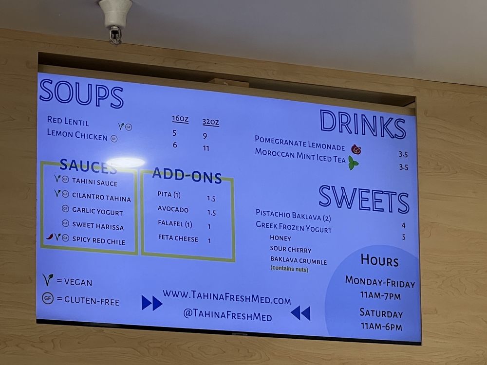 “ Came here on a weekday afternoon and it was a little busy, but I got my Cali Bowl quickly. I also added falafel to my bowl for an extra $3.50 and it came with three of them. I thought the portion size was good, the veggies were super fresh, and I liked how much hummus and sauces they had. It was a very well-dressed salad, not to mention both pretty and vibrant, with lots of different flavors from the tangy pickled veggies, the savory and earthy sauces, and the crispy veggies! There is some seating inside shared by the rest of the Alameda Marketplace. Tahina also sells some pre-packaged hummus, baba ganoush, etc., which I look forward to taking home with me in the future. Looking forward to my next meal here! ”